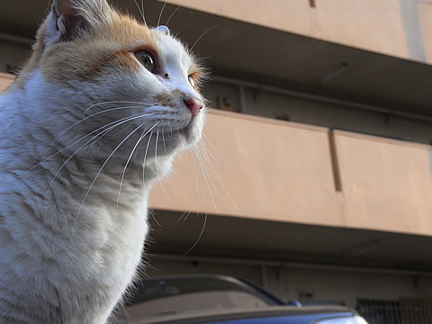 まいける君(裏の駐車場に住んでいるネコ)のいい写真が撮れたので。下から撮ると大迫力(^^)。
