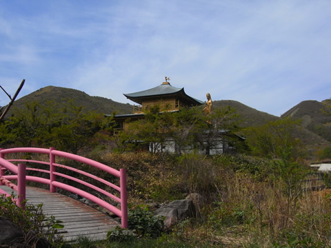市営温泉の裏には、謎の実物大金閣寺と巨大仏像。なんじゃこりゃ。(モンテローザというバブル期のリゾート遺跡らしい。非常に痛い。)。