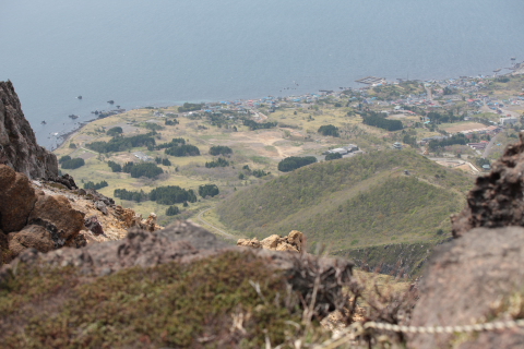 登ると海が見える。津軽海峡を挟んだ向こう側は下北半島(青森県)。とてもいい景色。恐山も見えた。