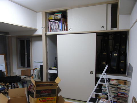 レッスンの部屋も音楽関係の書籍や楽譜を入れる。また、電子楽器類やギターなども使用可能な状態に配線して押し入れに。これで、押し入れを空けるだけで電子楽器やギターなどが使用できて満足(^^)。