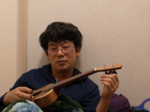 お酒が飲めないので当然酔っぱらい、真っ赤になり、毛布にくるまってウクレレなんかを弾き出したところを嫁さんに激写された(^^;。我ながら何をやっているのだか。この写真撮られた覚え無し。カメラを見てみたら写っていた。