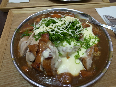 名古屋に着いてからまず大須観音に行き、「名古屋肉味噌カレー研究所」というカレー屋さんに行ってみた。赤味噌味の挽肉にカレー。トッピングとして奮発して全部乗せ:鳥肉+トマト+チーズにしてみた。ネギとマヨネーズをかけて食す(^^;。新名古屋めし!?。