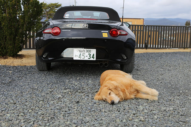 宿に戻ってきたら宿の飼い犬がレンタカーの後ろで陣取っていました^^;。