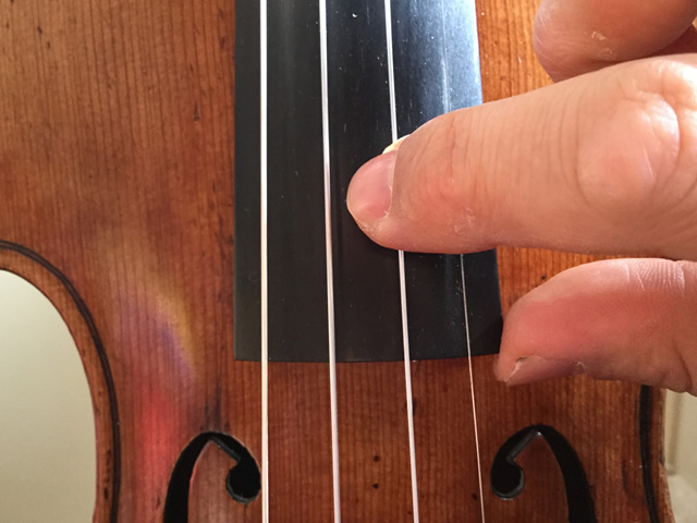 通常は指板の上の弦をはじきます(弓で擦る場所ではなく)
