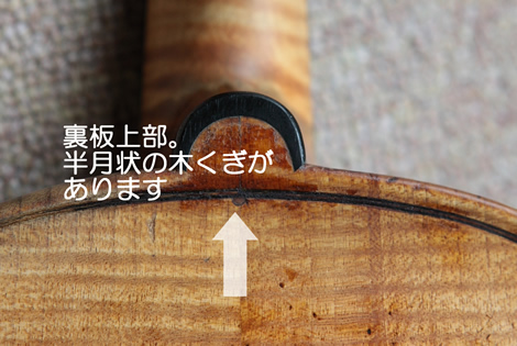 よ くできた名器のレプリカは、この木くぎの特徴をたいてい押さえてあります(ヴィヨームやヴォラー・ブラザーズ、また、現代のレプリカなど)。そのため、半 月の木くぎだからと言って本物とは言えません。また、後世の修理によって木くぎが無くなっている場合などもありますので、木くぎがないからと言って、贋作 と言い切ることもできません。
