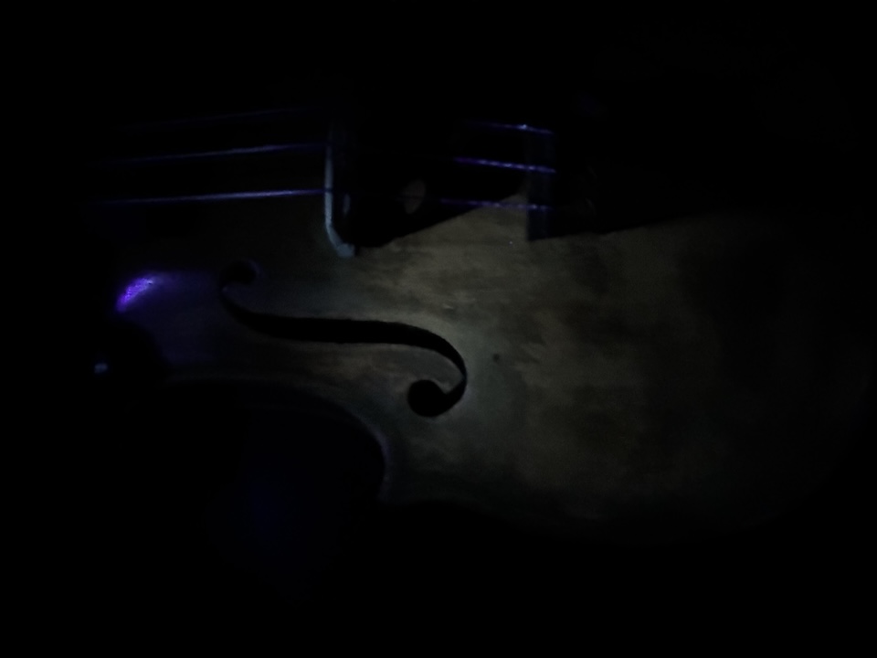 紫外線ライトを当てた写真。iPhoneで撮るとだいぶ実際の見え方と異なるが、年式相応にニスはムラだらけ。ストラディヴァリも含め紫外線で見るとこんな感じで長年に渡る修復が層になっているもの。