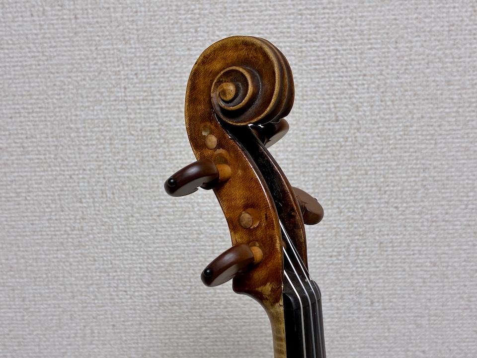 スクロールは形は悪くないし、材質もそれっぽいし、叩いた音も古い木材の甲高い音がする。けれども渦巻の掘り始めがオールドイタリーにしては浅い印象。別の製作家の作かもしれないし、国も異なるかもしれない。ブッシングは3回、継ぎネックも2回行っているようだ。