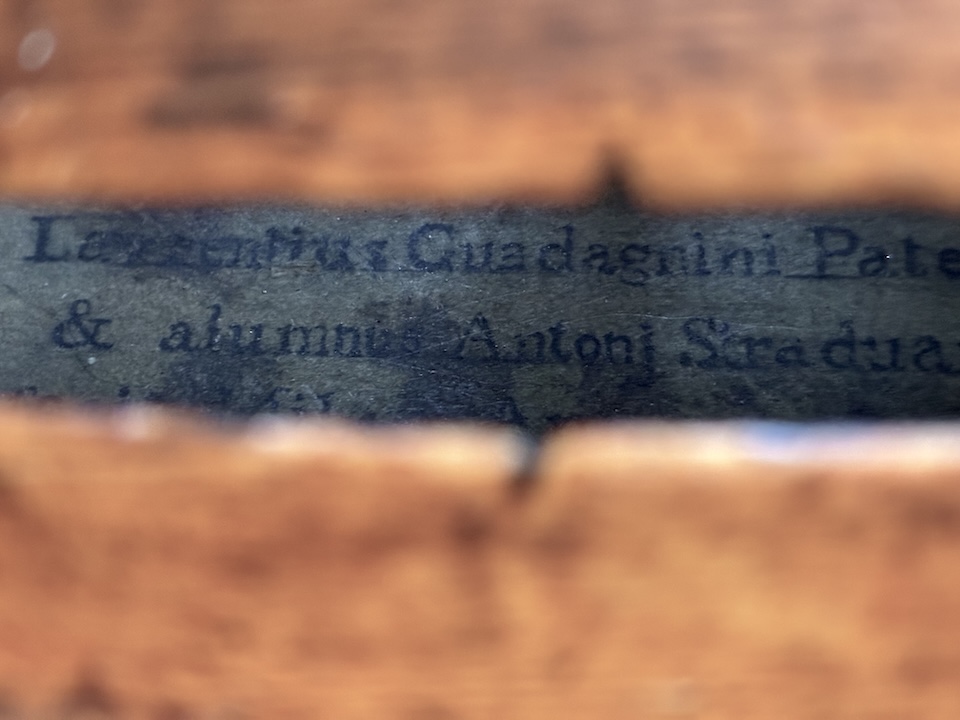 ラベルはあるが、「ロレンツォ・グァダニーニはヴァイオリン製作家ではなかった」が現在の定説。ラベルが頼りにならない典型例。古そうに見せてはいるものの立体感不足でオールドのラベルとは異なる。